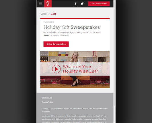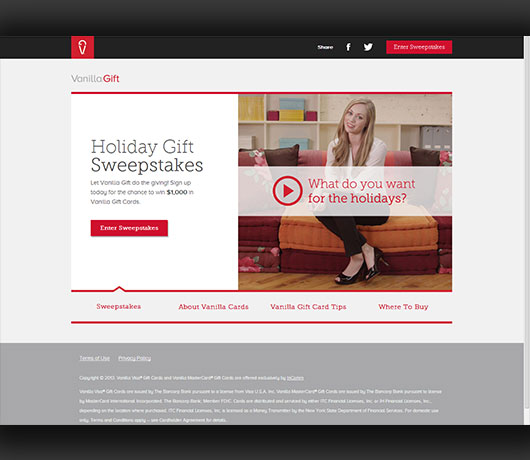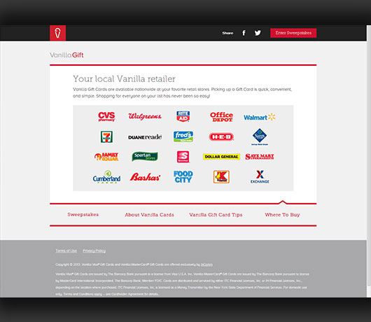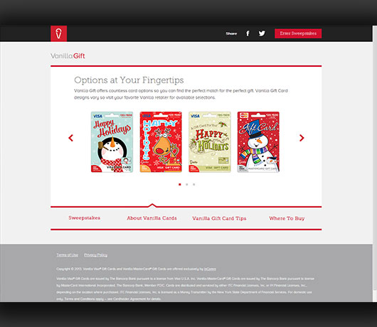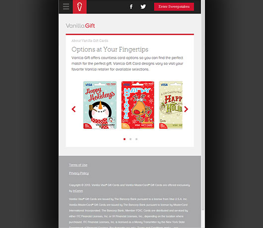 Incomm is a prepaid card and transaction technologies company. A Million Options is the VanillaGift gift card sweepstakes. I provided the HTML, CSS and JavaScript development of this site. It is completely responsive for tablet and mobile devices.